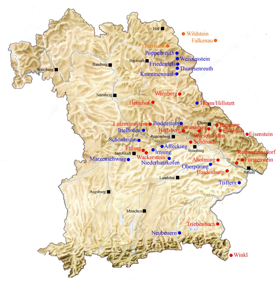 FamiliensitzeDie wichtigsten Burgen und Schlösser, die einst im Besitz der Familie warenBis jetzt anklickbar:Thierstein, Weissenstein, Wernberg, Falkenau, Hillstett, Thann, Affecking, Heilsberg, Bodenstein, Aholming, Wiesenfelden, Niederhatzkofen, Schönach, Friedenfels, Poppenreuth, Thumsenreuth, Krummennaab, Runding, Lutzmannstein, Ettling, Wackerstein, Blaibach, Altrandsberg, Böhmisch-Eisenstein, Fürstenstein, Ittelhofen, Wildstein, Heimhof, Neubeuern, Winklhof, Triebenbach, Haidenburg, Oberpöring, Irnsing, Schönbrunn, Märzenschwaig Braun: Egerländische Stammsitze Rot: Sitze der Wernberger Linie Blau: Sitze der Weißensteiner Linie |