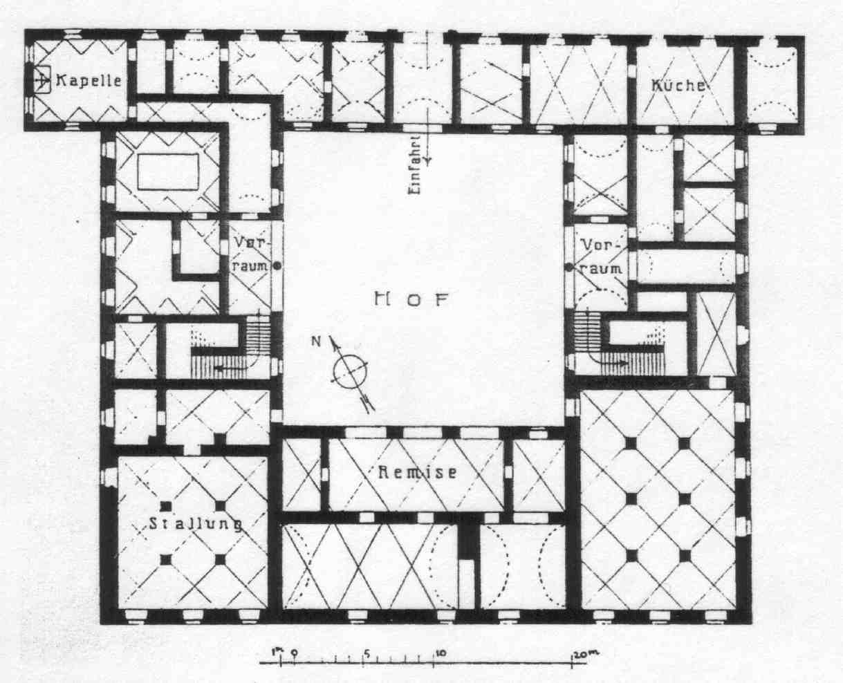Wie bereits auf Wenings Kupferstich dargestellt, bildet das Schloss Niederhatzkofen noch heute eine imposante Vierflügelanlage, bei welcher die